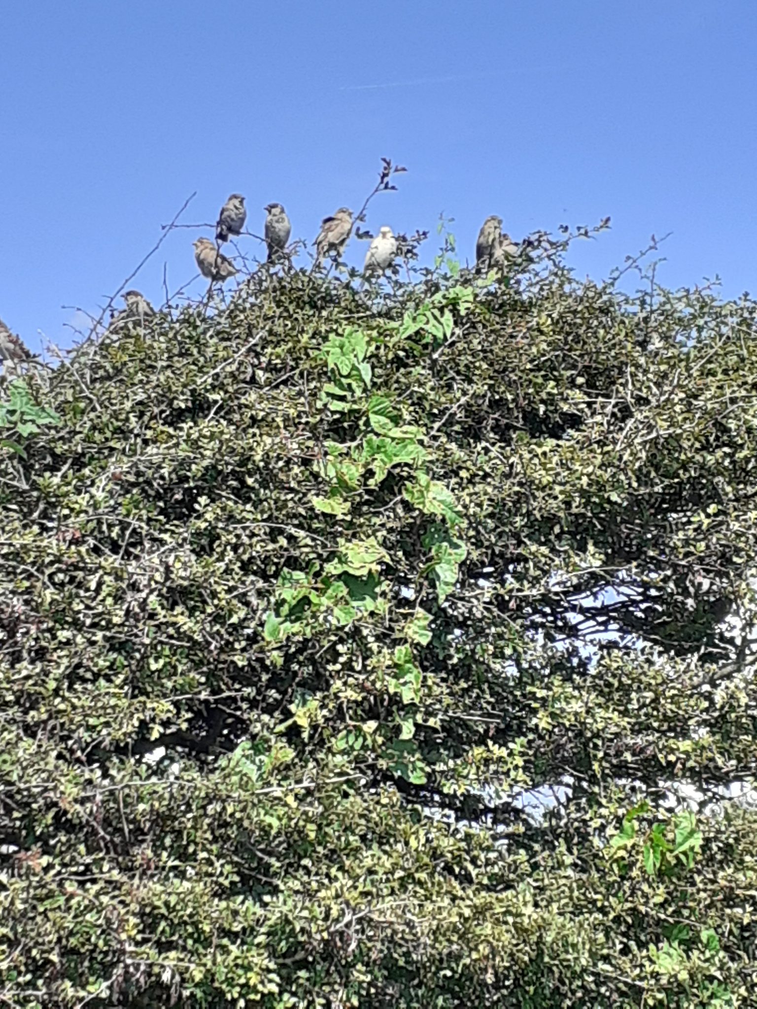 13 Collared Doves and 9 Goldfinch perched in the Silver Birch outside my bungalow until they exploded into flight as a male Sparrowhawk made a unsuccesful attack and continued through the graveyard of St Davids church Penllergaer. A few Song and Mistle Thrush also around the church area.