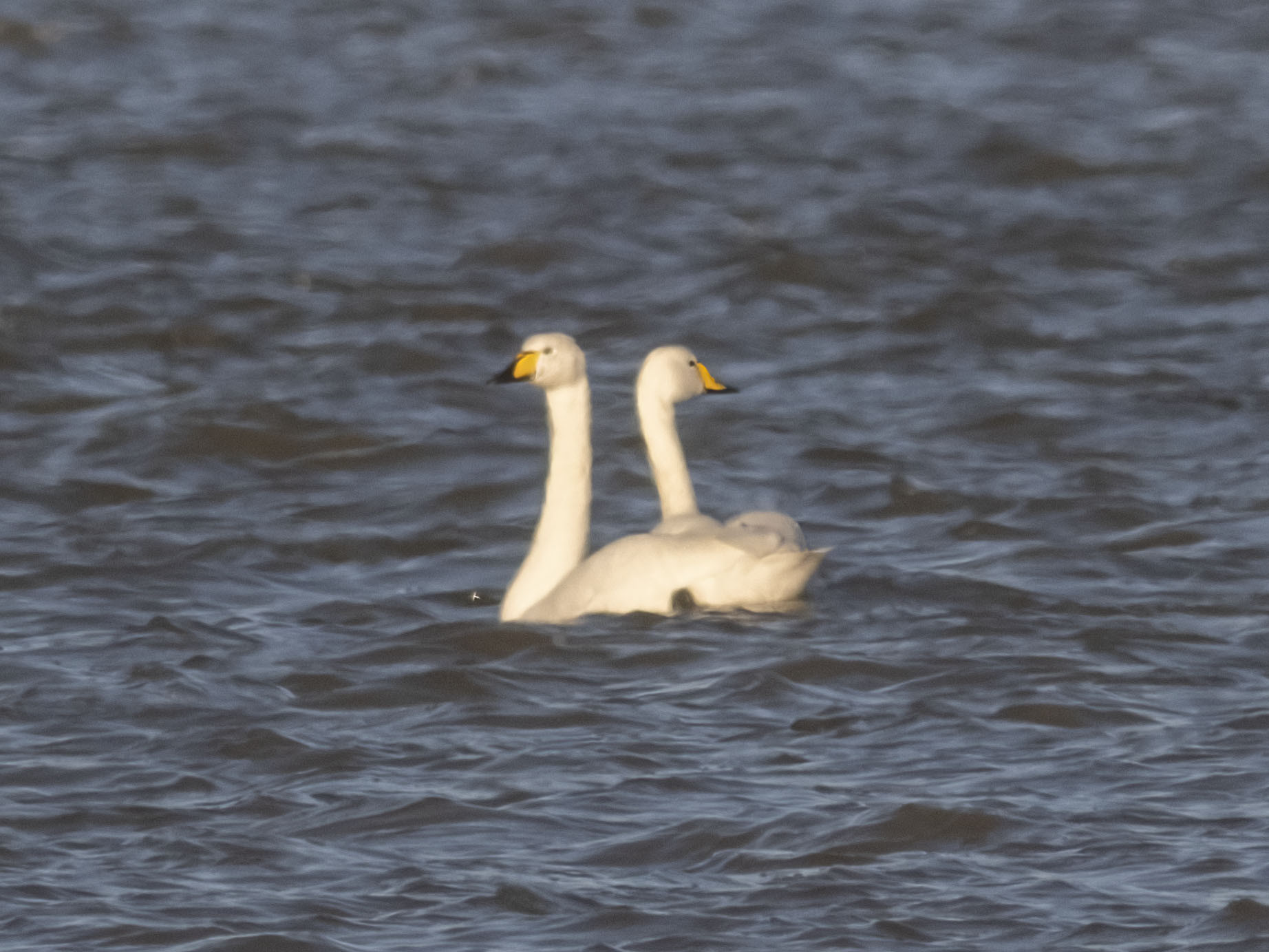 A pair of adult Whooper or Bewick’s Swans currently sat off Crofty with Brent Geese (viewed in heat haze from the Carms side of the estuary. A male Marsh Harrier flew over them this morning when scoped from the WWT Llanelli office