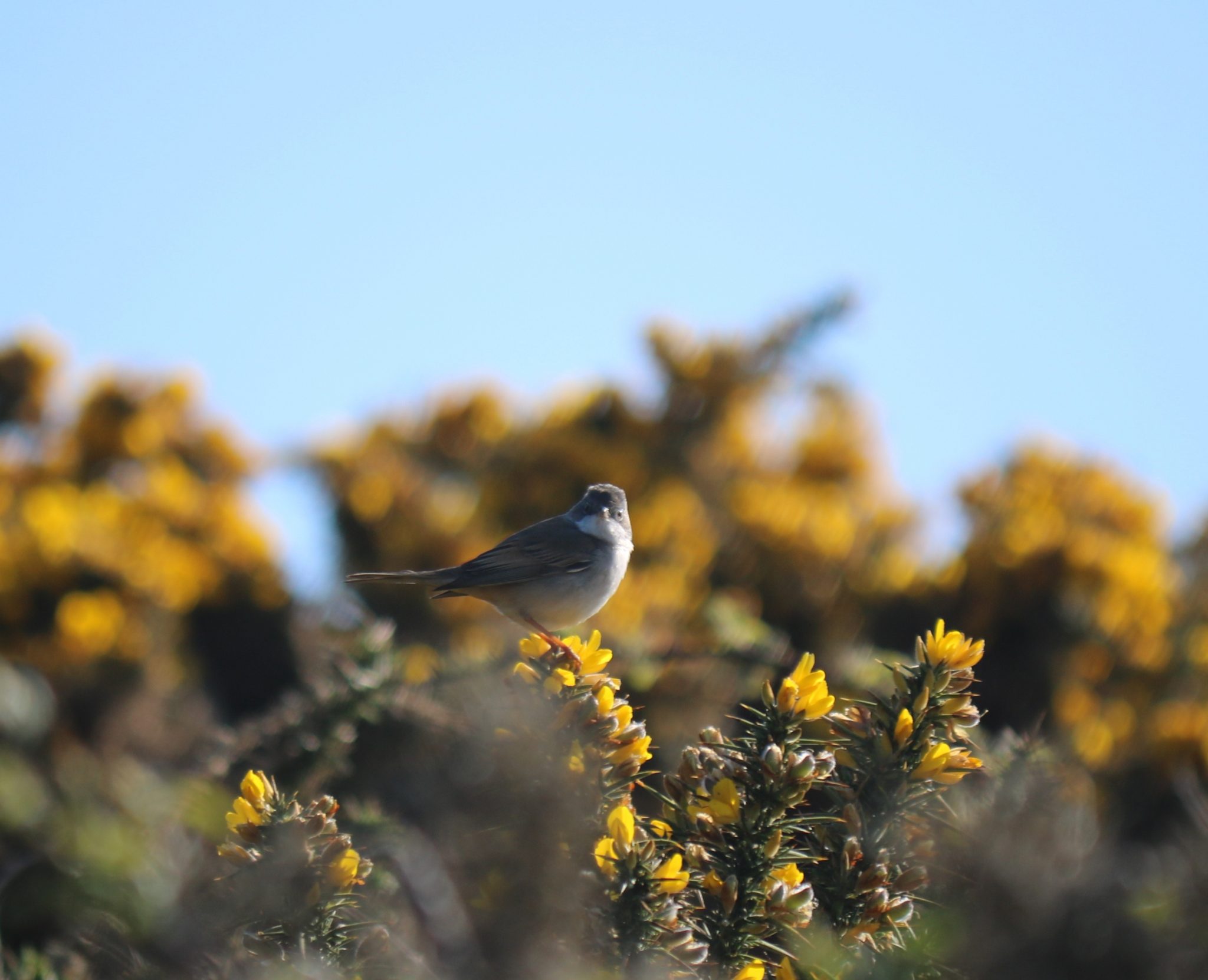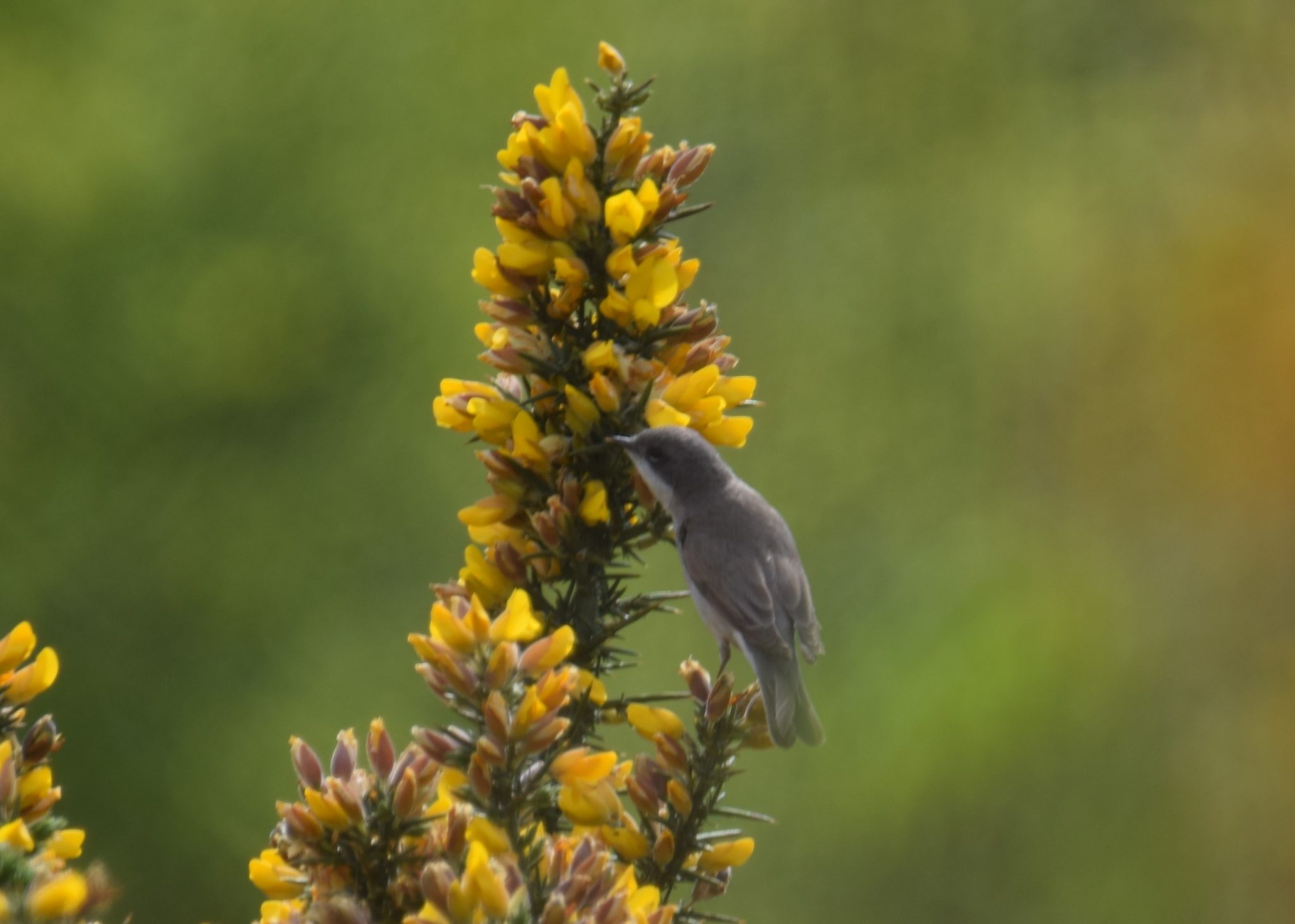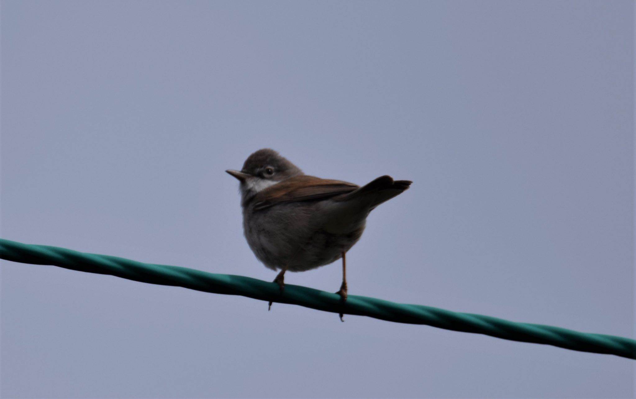 April 28 1500. Stonechats, common whitethroats and a lesser whitethroat in song, south east Cefn Bryn. Pictured, common whitethroat on telegraph wire above lesser whitethroat on gorse bush.