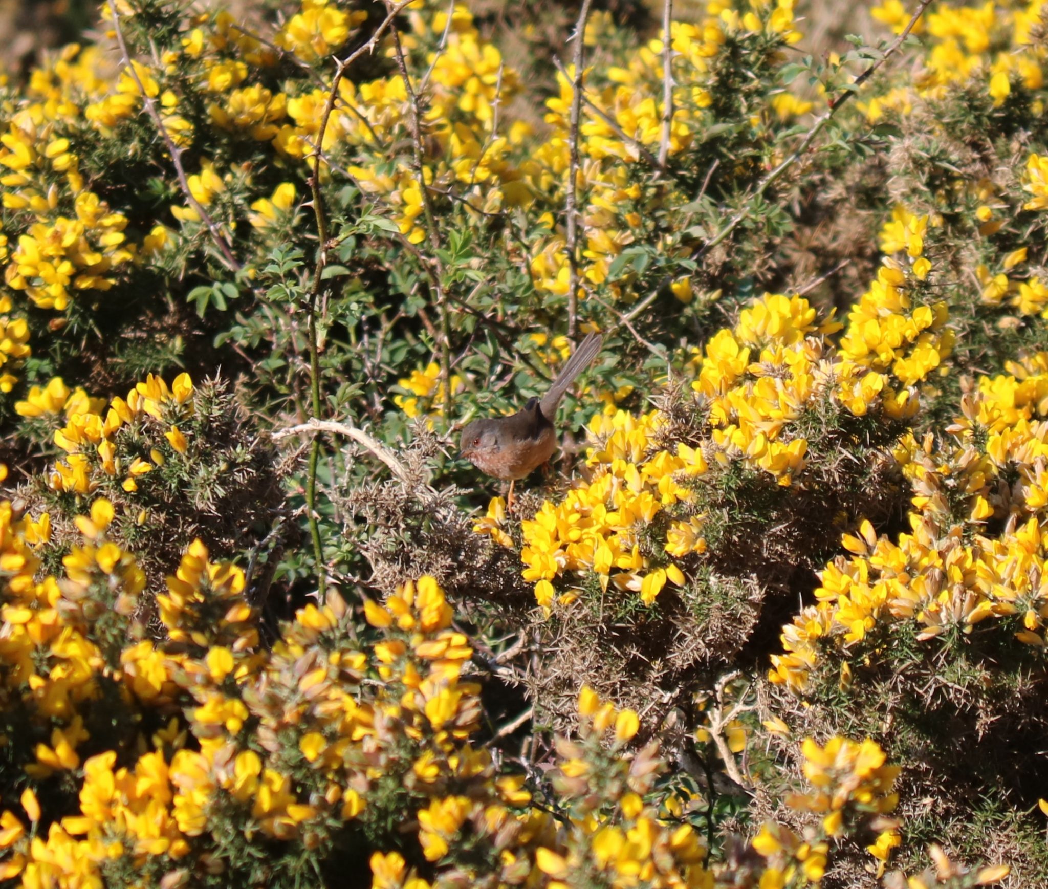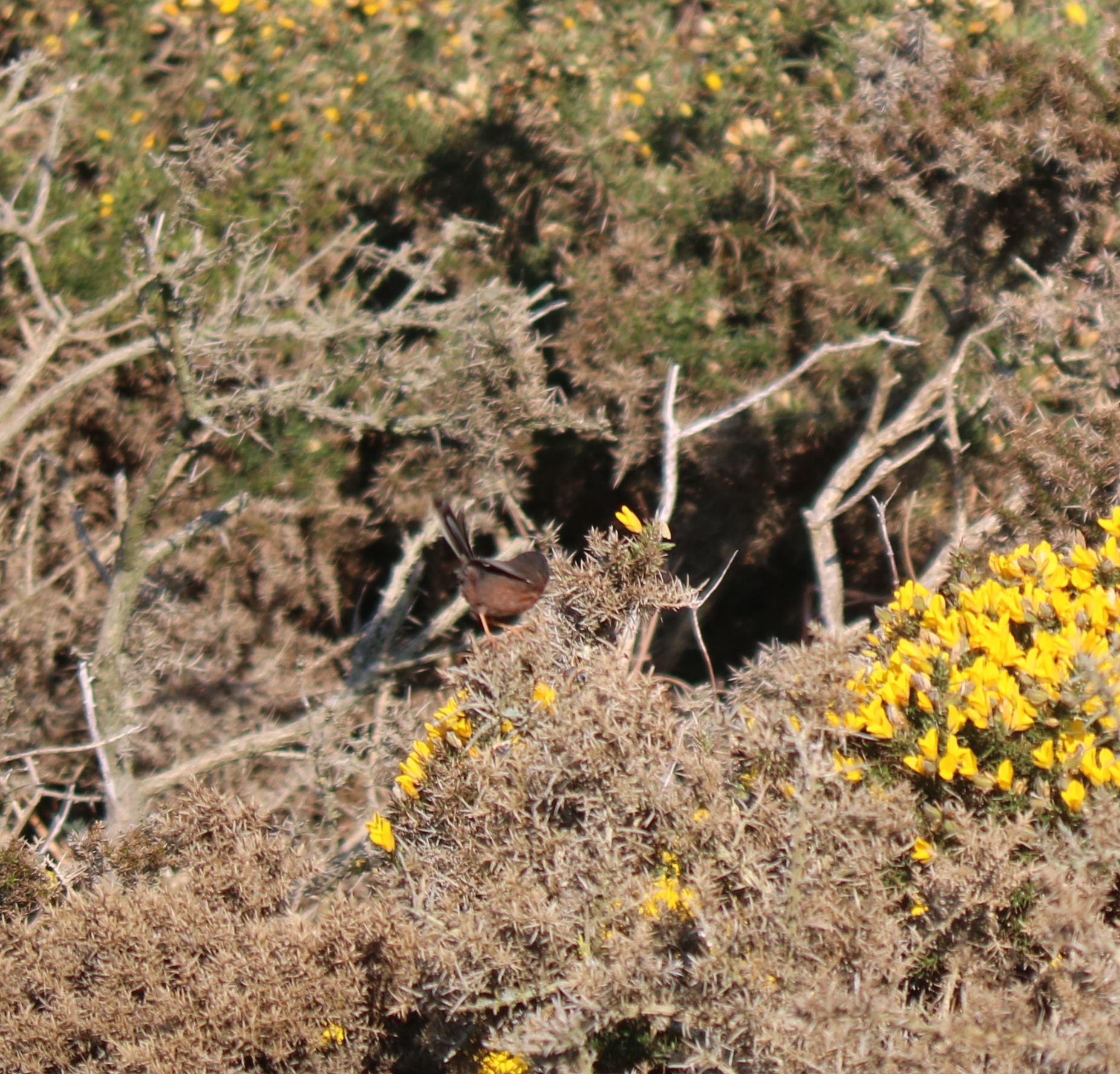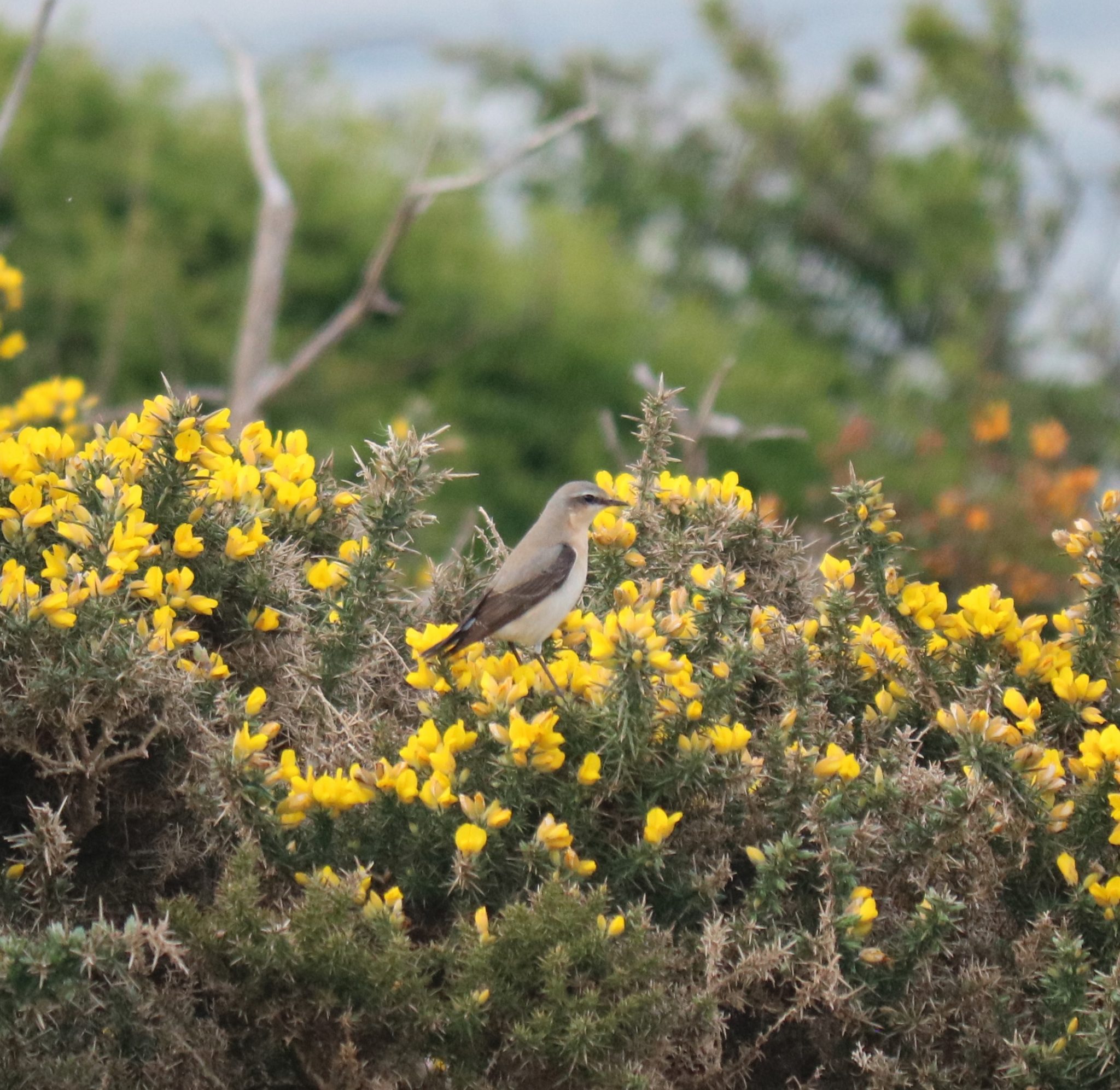 April 28 1500. Stonechats, common whitethroats and a lesser whitethroat in song, south east Cefn Bryn. Pictured, common whitethroat on telegraph wire above lesser whitethroat on gorse bush.