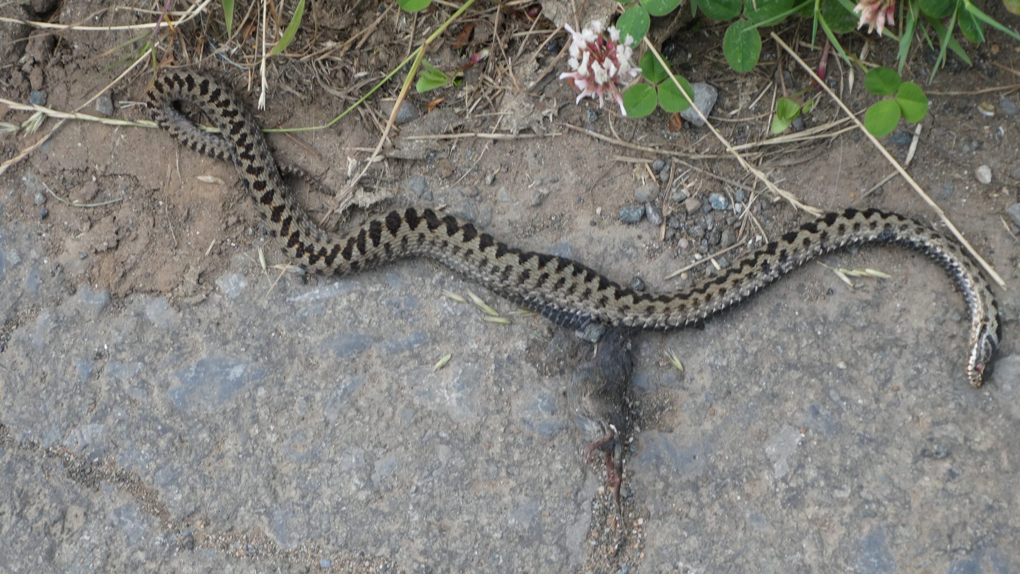 West Cliff, Southgate, this morning: Whitethroats, Goldfinches and a flock of Linnets. Only a couple of Swallows at Hunts Farm, Peregrine flying low along the cliff, Kestrel higher up and three Herons flying together from the roost to fishing grounds. Also this dead Adder and Field Vole on the road, probably run over by a car.