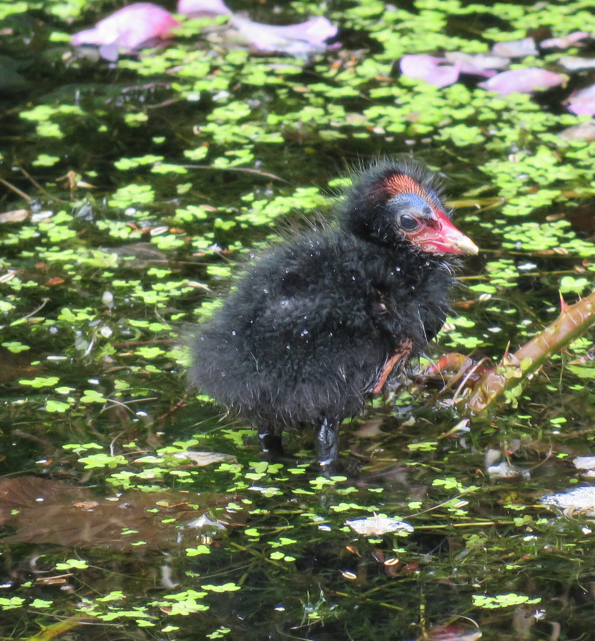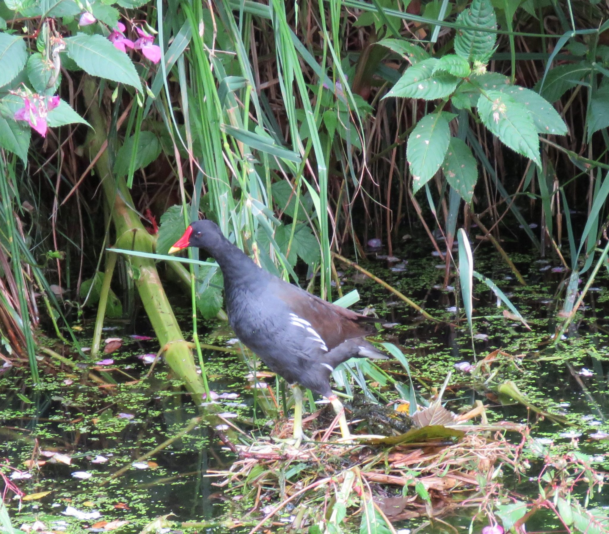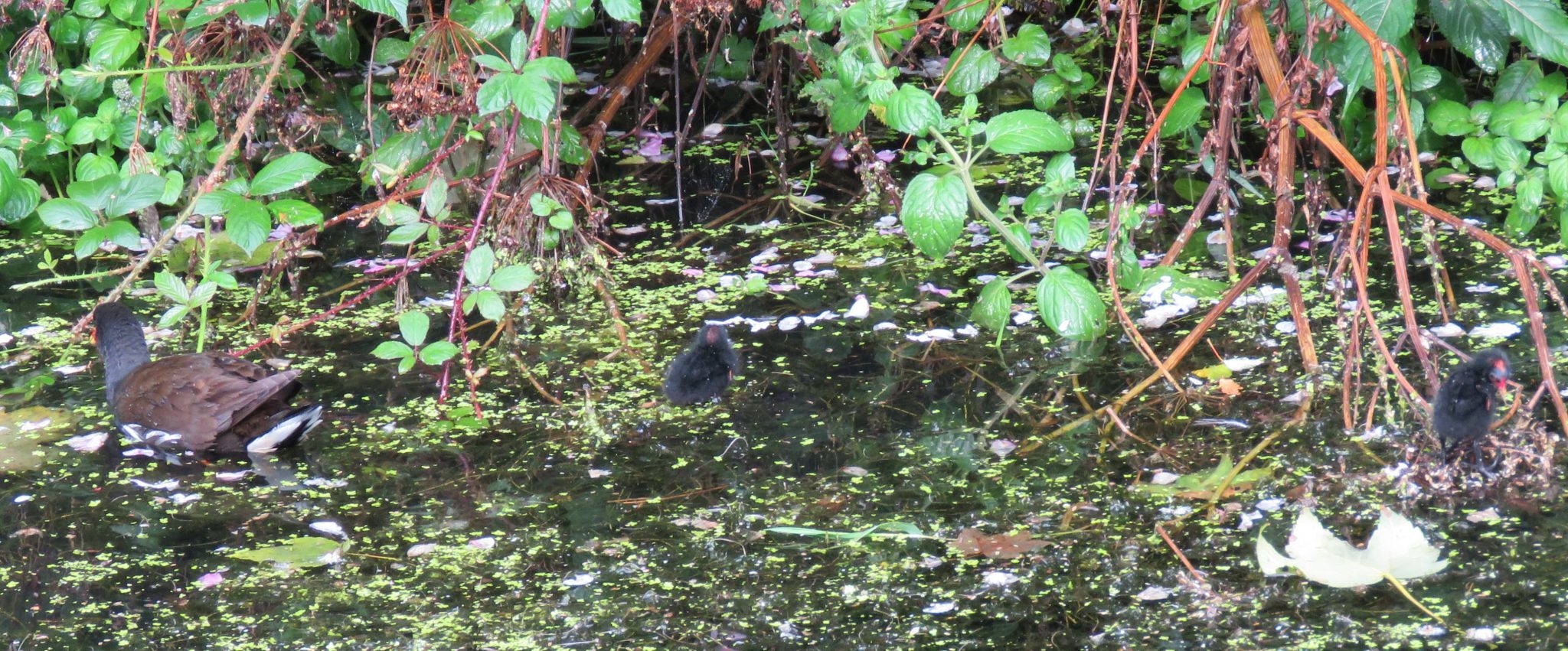 The Canal,Trebannws.Moorhen still breeding. Two “active” nests.Last evening one hen was sitting tight on one nest by this morning there were two chicks. Another hen was sitting tight this morning until disturbed by a spaniel