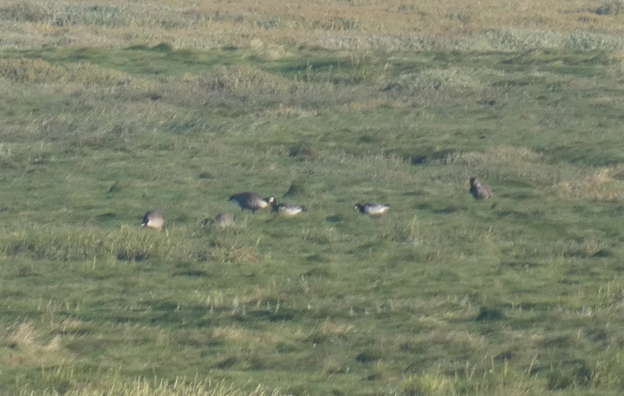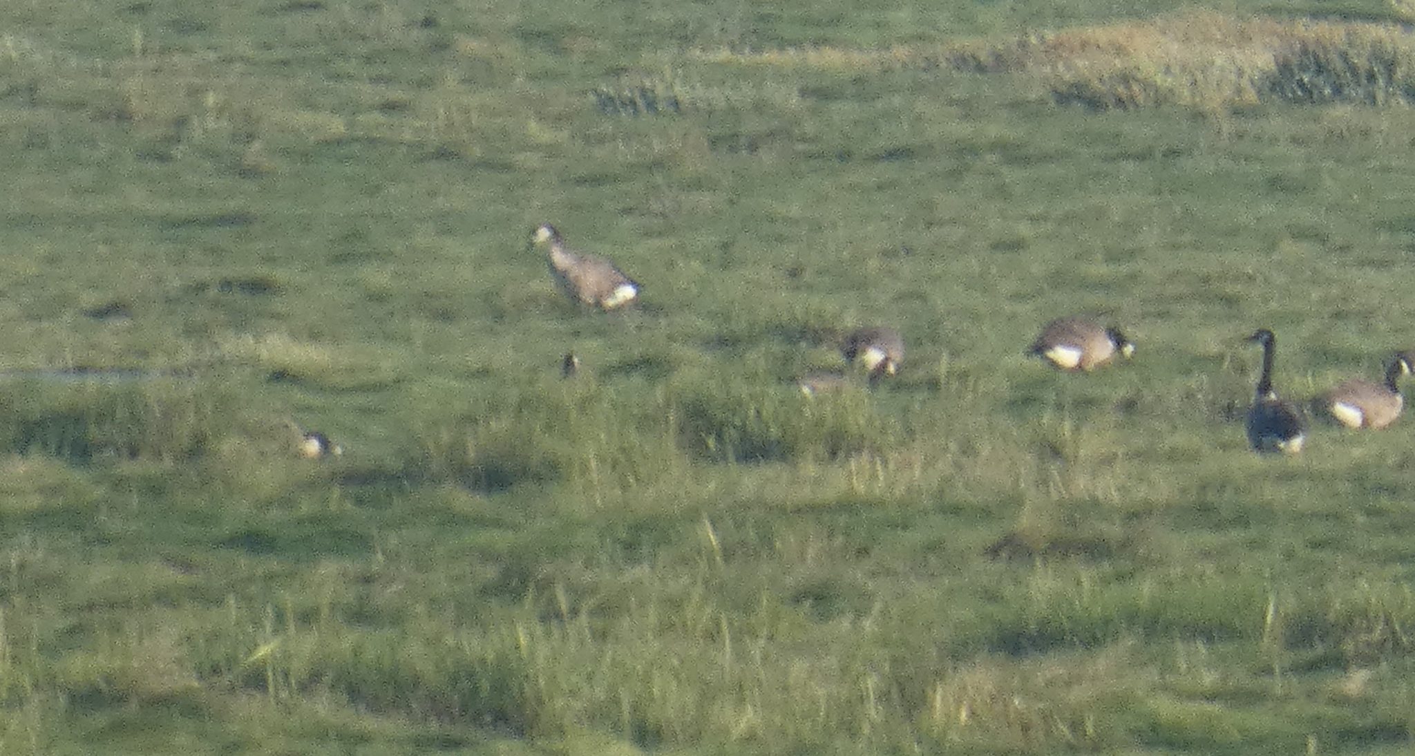 2 Barnacle Goose associating with 82 Canada Goose and 7 Greylag Goose on the Penclawdd Marsh right now