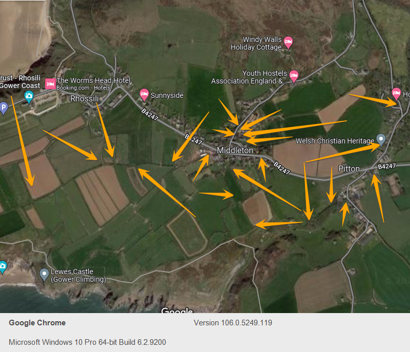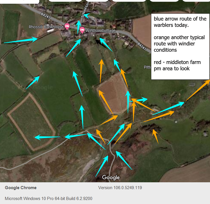 I have attached 2 maps one from what the birds did today and the movements Also the other where I search after the morning movement from past experience. Whilst Rhossili is a tricky place to bird it truly is fantastic. Middleton farm does certainly get the afternoon stuff which has filtered up ( totally proven). Late day influxes do occur though on the vile and at Mewslade Hope this helps