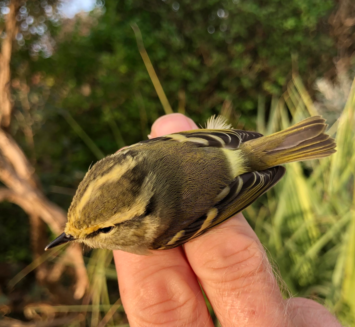 i caught and ringed a Pallas’s Warbler in my garden on Pennard cliffs earlier this morning.