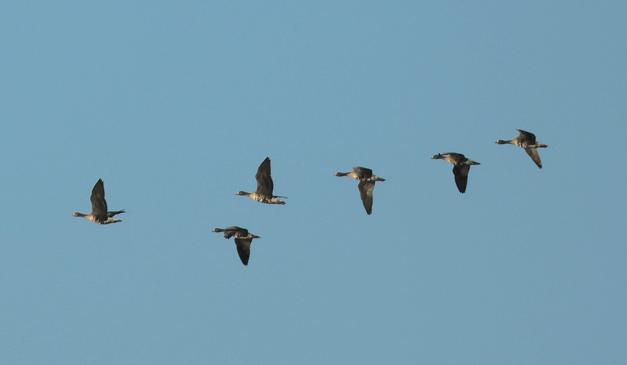6 European Whitefronted Geese flew down the Loughor estuary this morning, viewed from Loughor foreshore (Glan-y-mor Park).