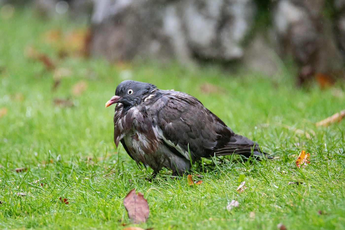 This a dark morph woodpigeon, which is now a regular in our garden. Wet and hangdog, he is the picture of dejection. Other pigeons bully him.