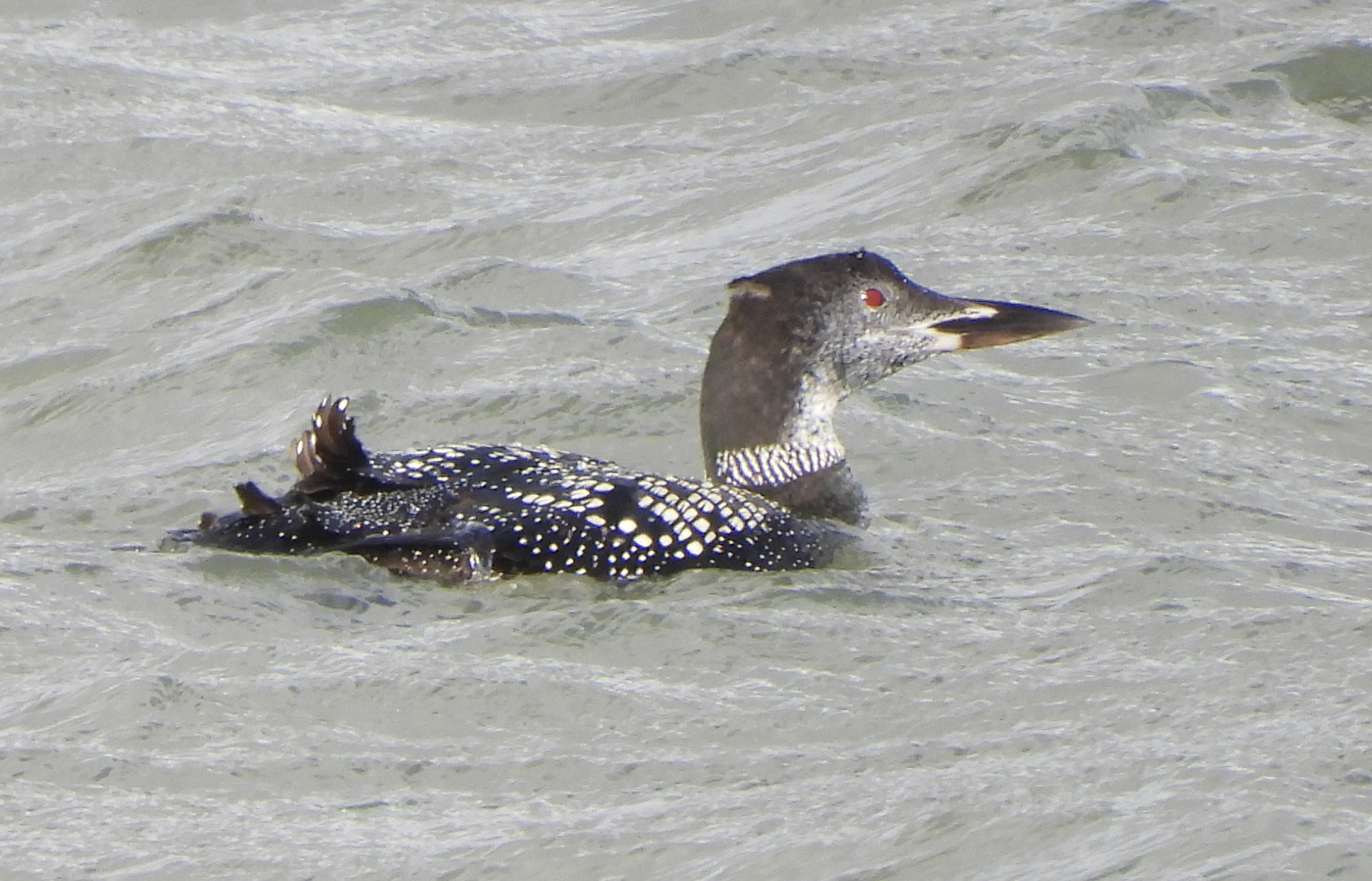 Mumbles seafront high tide this afternoon saw what looked very much like a red-throated loon – solo, moving along next to the sea wall. We also think we saw one a cpl of weeks ago at high tide bobbing along from the rowing clubhouse to the pier and beyond. Pic not great sorry but we had a really good look at it and checked with the field guide.