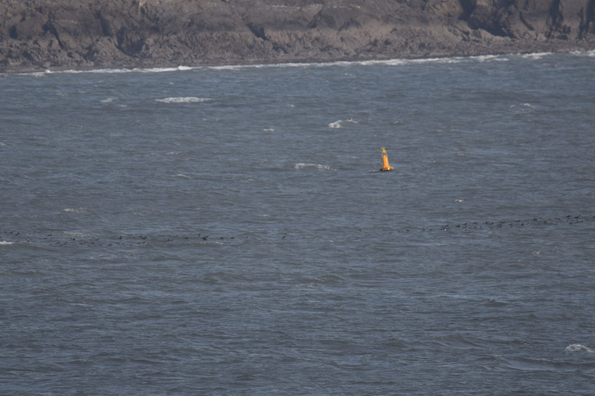 c100 scoter around yellow buoy off Three Cliffs Bay (photo part of flock from Oxwich Head) and ? auk sp ?? razorbill in bay (also a long way off). Heron, little egret, 6 curlew, 4 turnstone Oxwich Head and female sparrowhawk on clifftop. Dec 15th, 1430.
