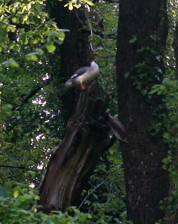 Isolated Cwm Tawe area. Goosander at nesting site.Chicks are ready to depart but high water levels and fast flow mean its a risky business today.Unfortunately did not have a long lense.