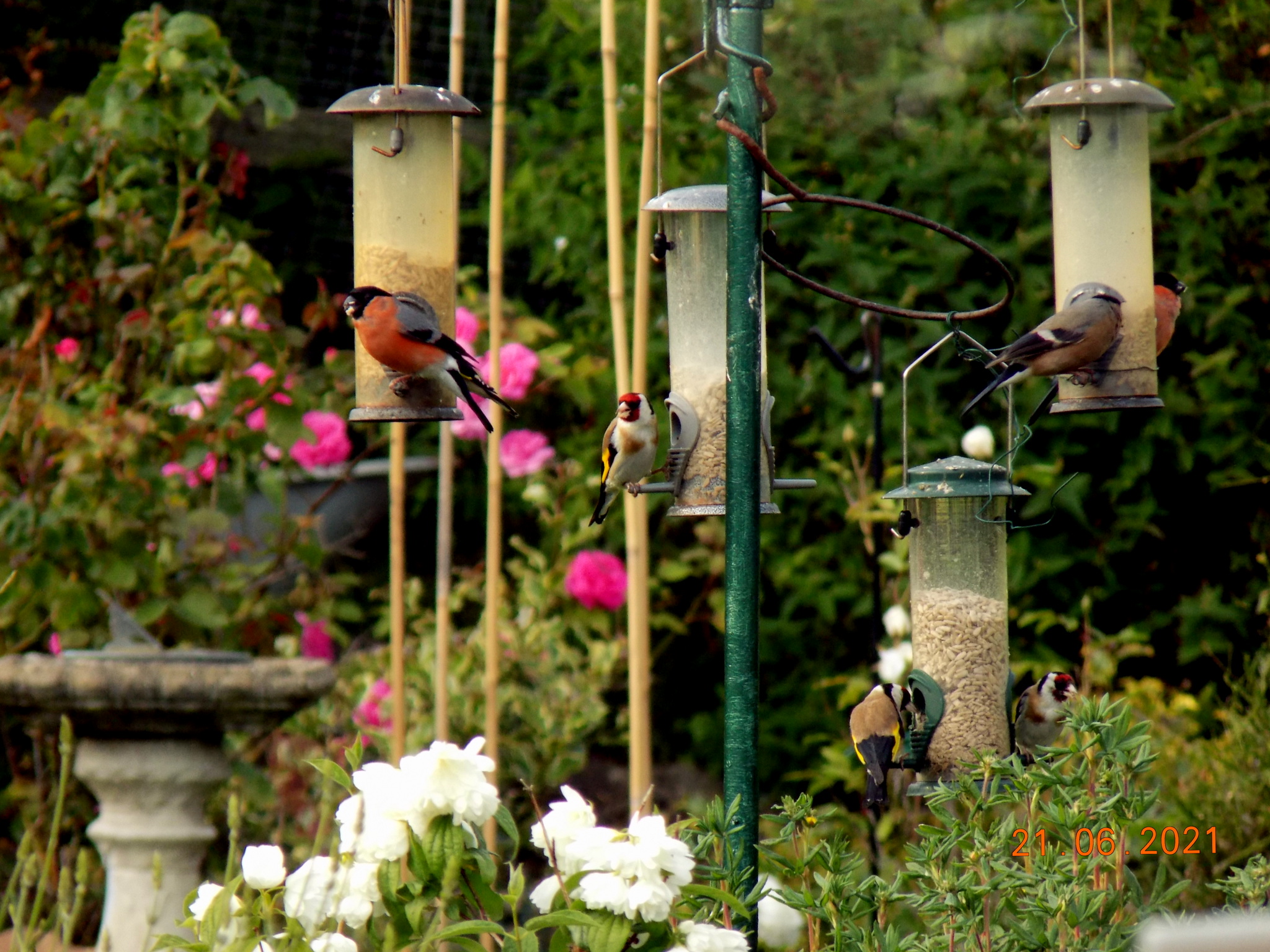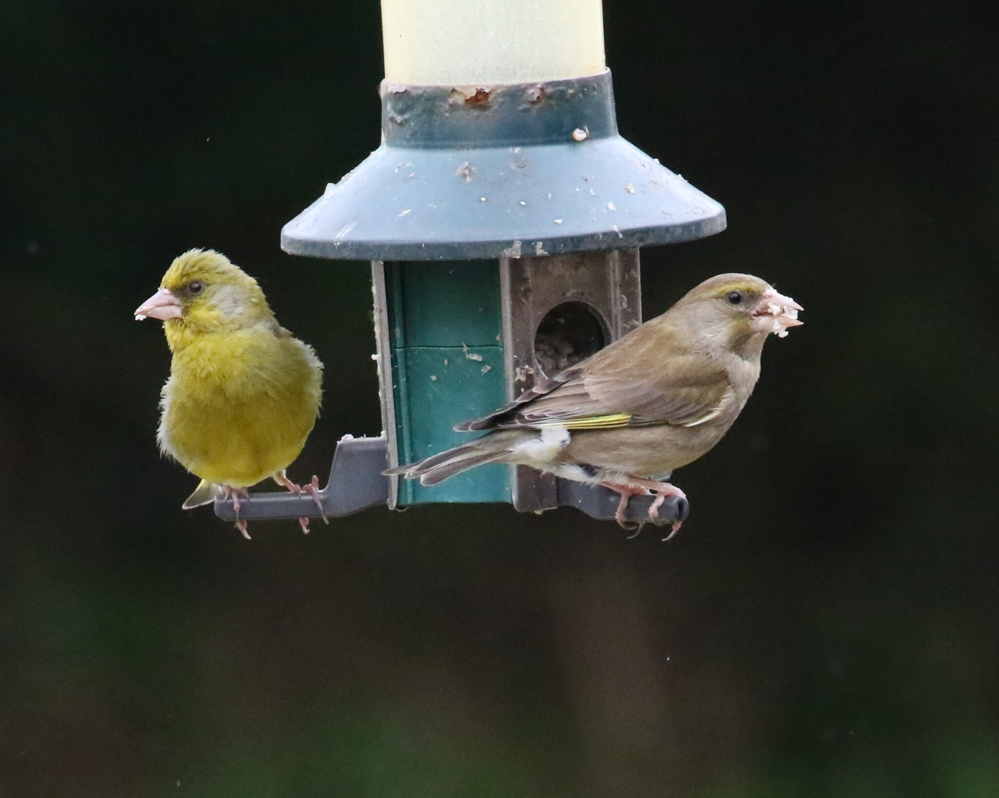 Today a pair of Siskin have joined the throng I described yesterday on our bird feeders in Manselfield.