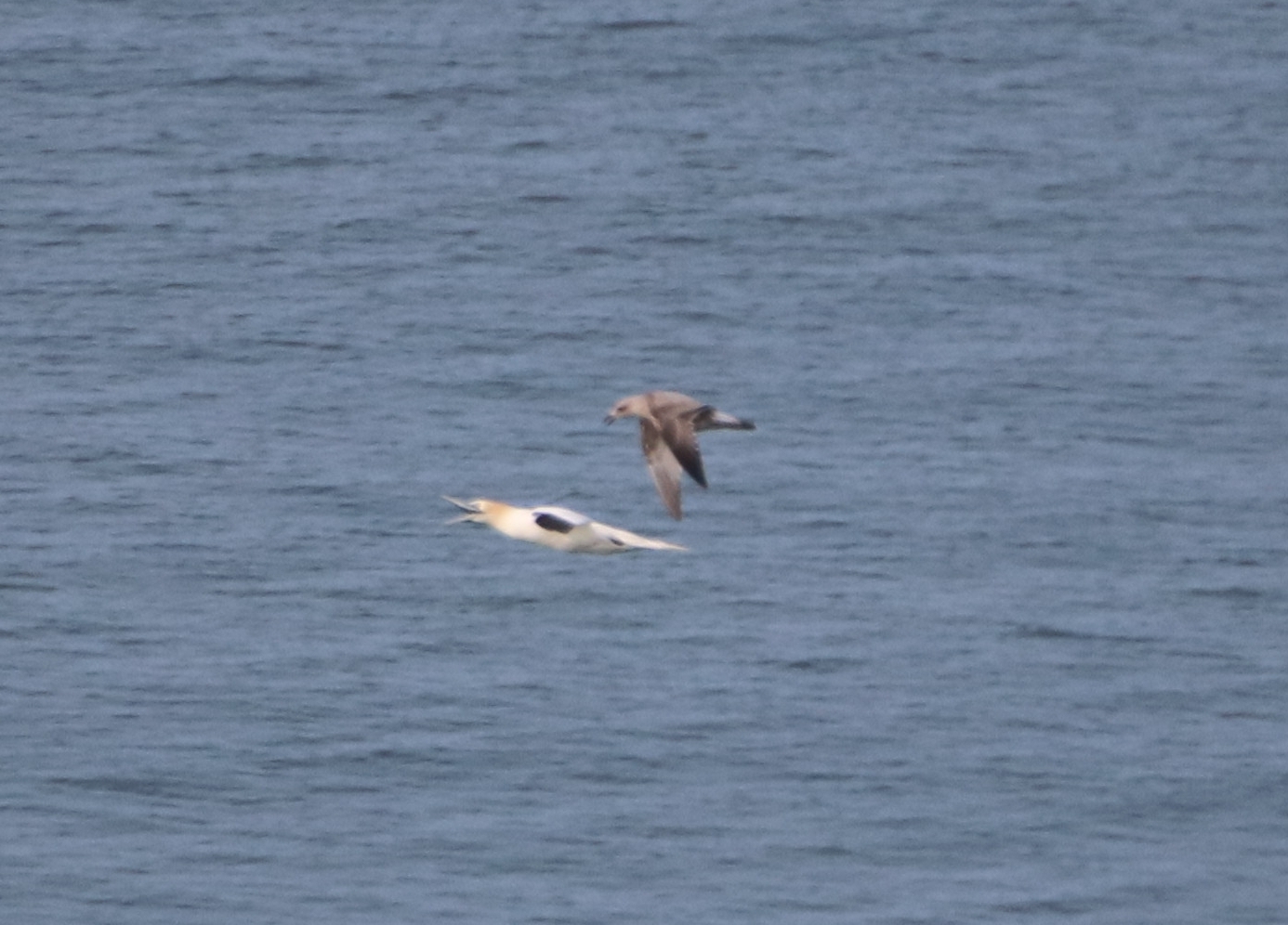 Quite a few times this summer I have seen gannets tracking porpoises or dolphins out to sea from Southgate, occasionally diving but perhaps also picking up scraps. This morning 7 or 8 gannets. Can you experts identiify the gannet-chaser? (I can’t.)