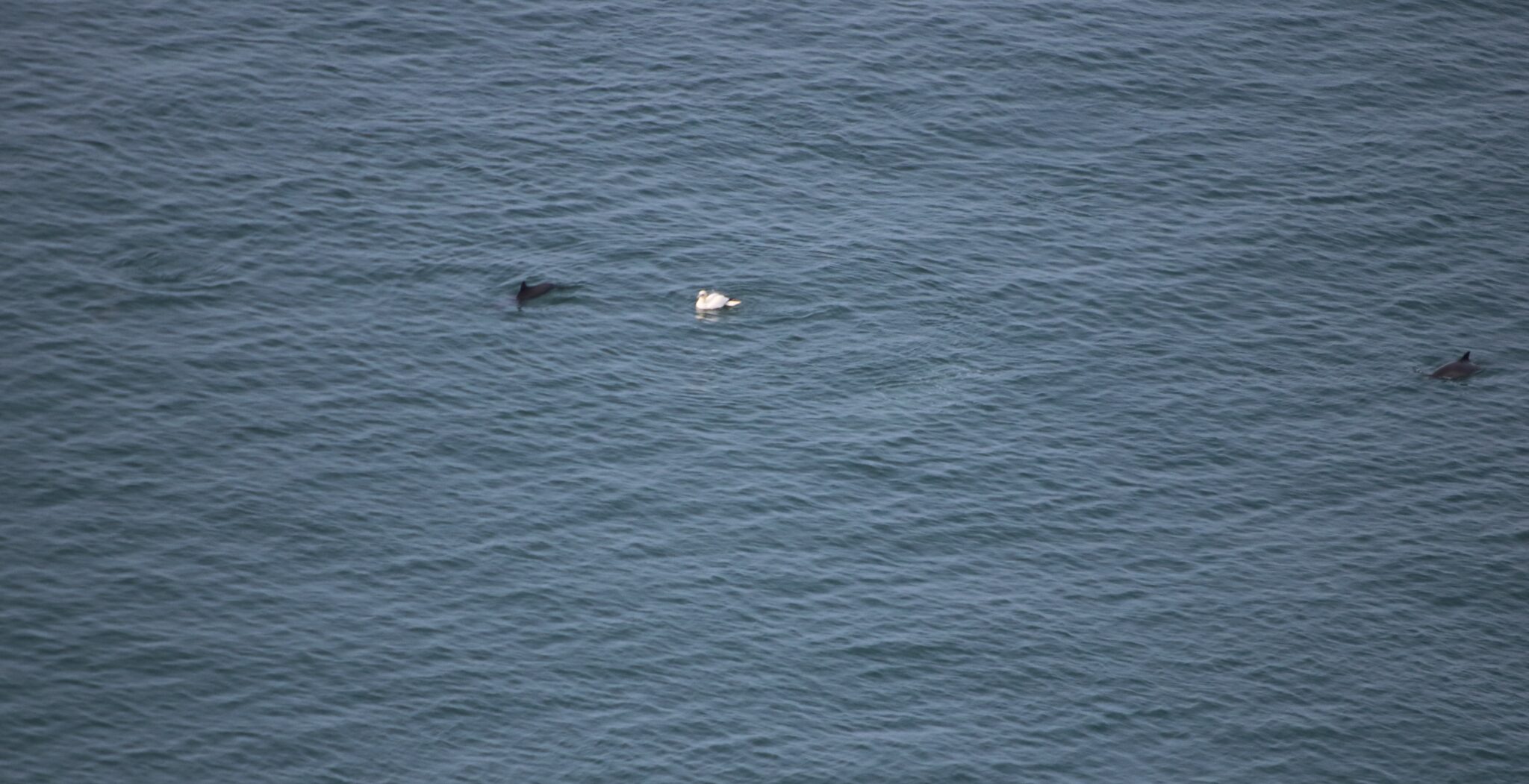 Oxwich Point at dawn: 8+ common dolphins moving east, 3 harbour porpoise foraging, 2 grey seals in the shallows, 9 whimbrel and 1 curlew west. A redshank on the rocks. Large scale movement of Manx shearwater up channel started at around 06:40.