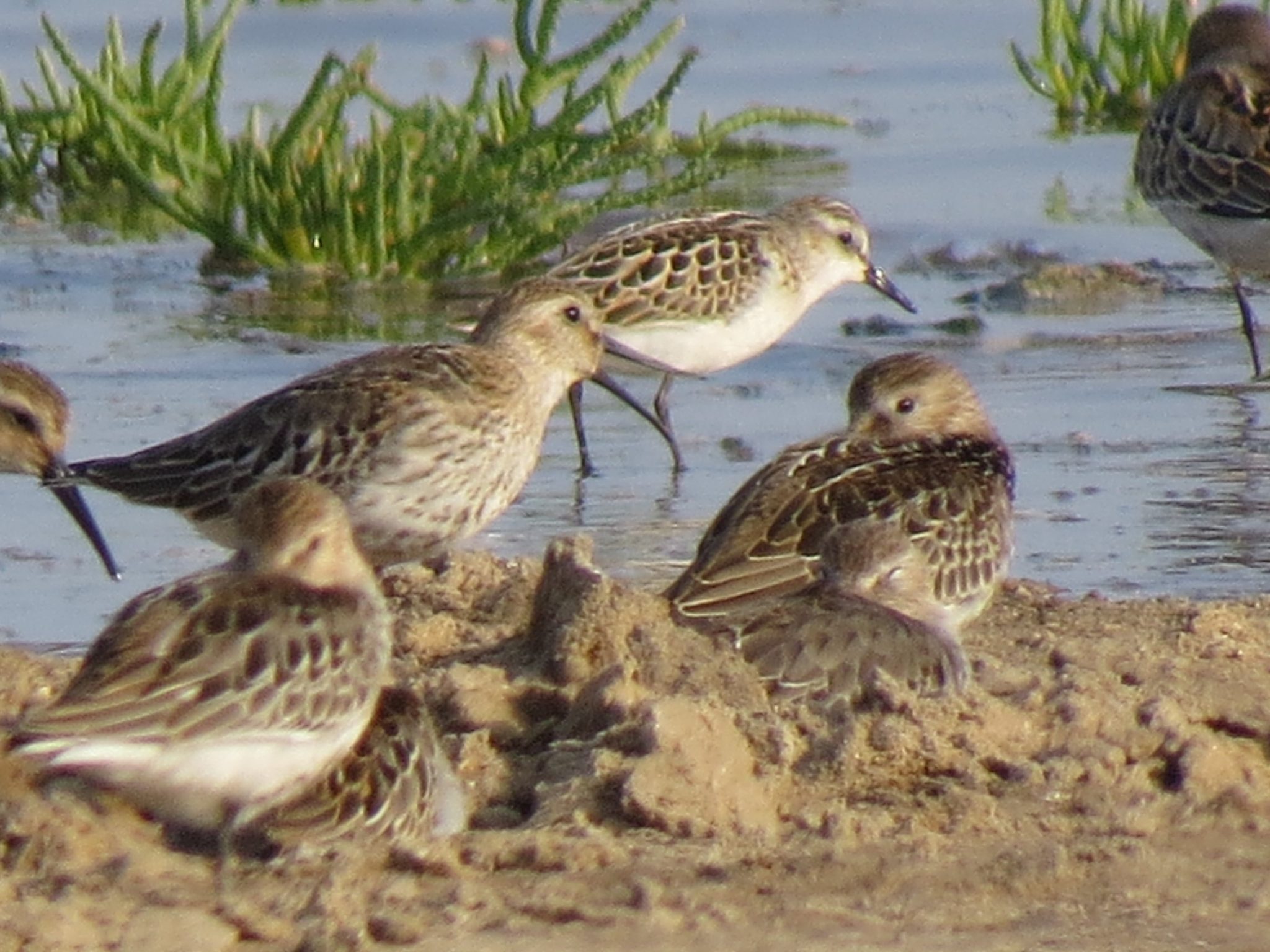 Oxwich Marsh: 4 grasshopper warbler, garden warbler, 2 willow warbler, small numbers of reed warbler (c. 10) and sedge warbler (3), snipe. Several tree pipit and a few grey wagtail over.